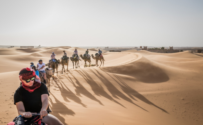 Day 4: Fes → Ifrane → Cedars Forest → Ziz Valley → Merzouga Sahara After breakfast, we drive south through Imouzzer to visit Ifrane, a city renowned for its alpine-style architecture and cool temperatures, earning it the nickname “the Switzerland of Morocco.” We continue to the nearby cedars forest, home to Barbary macaques. After a lunch break in Midelt, we proceed towards the Sahara, crossing the Tizi-n-Tilghmt pass and journeying along the scenic Ziz Valley, stopping for panoramic views. In the afternoon, we reach the Merzouga desert, where you will switch to camels for a trek across the sandy dunes. After a stop atop a high dune to enjoy the sunset, you will continue to a luxury desert camp. Here, you can enjoy Berber drums music while dancing around a campfire under a vast, open sky of stars before dinner and your overnight stay.