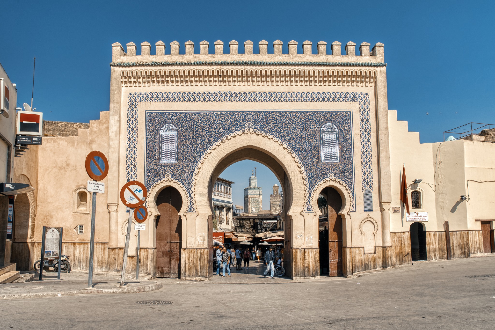 Day 4: Guided Sightseeing Tour of Fes Today is entirely dedicated to exploring the highlights of Fes with an expert local guide. You will dive into the world’s largest living medieval medina, visit the famous Blue Gate (Bab Boujloud), the Medrasa Bouanania, the Najjarine fountain, the fascinating Tanneries, and the Quaraouine Mosque and University. We will also visit the Jewish quarter (“the Mellah”) and drive to an ancient fortress for a panoramic view over the entire city.
